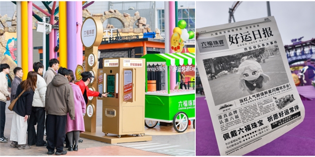 · 六福珠宝独家定制版“好运日报”,按下快门,即可生成专属头版好运头条,游客秒变“头条主角”。报纸机以新颖的互动形式迅速晋升为“超火打卡位”,引爆游客参与热潮,因其自带传播属性,拍照即传播,成功实现内容自产、流量自驱。